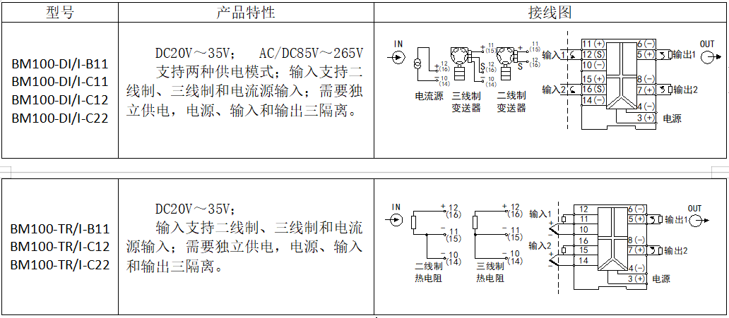BM100系列信號隔離器在工業(yè)生產(chǎn)中為增加儀表負載能力并保證連接同一信號的儀表之間互不干擾,提高電氣性能。BM100信號隔離器輸入支持三種輸入模式,兼容傳感器的三種接線方式,將輸入信號進行隔離輸出,輸送給二次儀表或PLC/DCS使用。