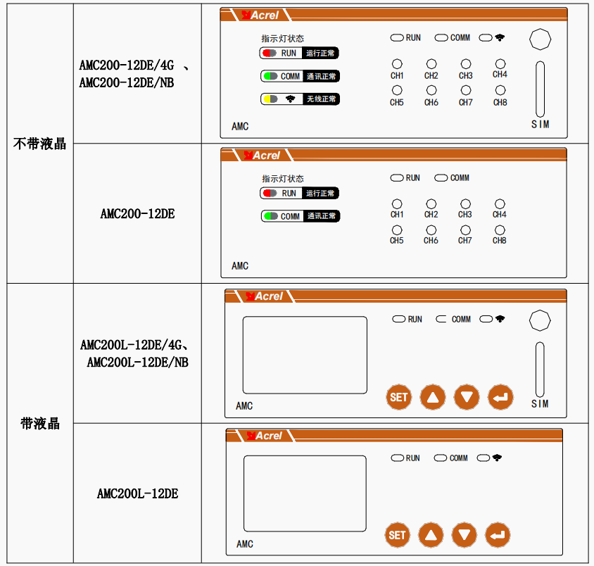 AMC200L-4E3/4G:可同時接入 4 個三相交流回路,可直接測量電壓,電流,功率,功率因數(shù)等 參數(shù),6 路開關(guān)量輸入(2 路有源,4 路無源)、2 路開關(guān)量輸出、1 路 RS485, 4 路 NTC 測溫,1 路溫濕度測量,4G 通訊,帶液晶顯示